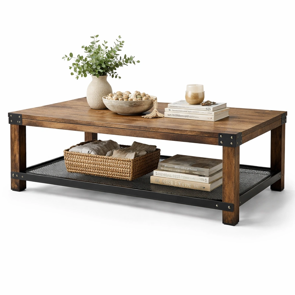 Beschreibung: Der rechteckige Couchtisch ueberzeugt durch eine robuste Konstruktion und ein funktionales Design. Die untere Ablage bietet zusaetzlichen Stauraum fuer alltaegliche Gegenstaende.
